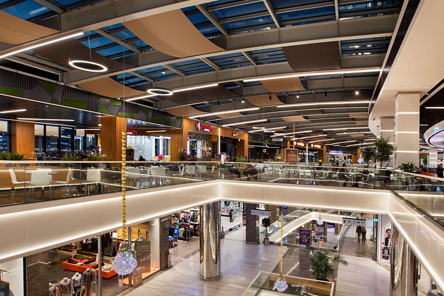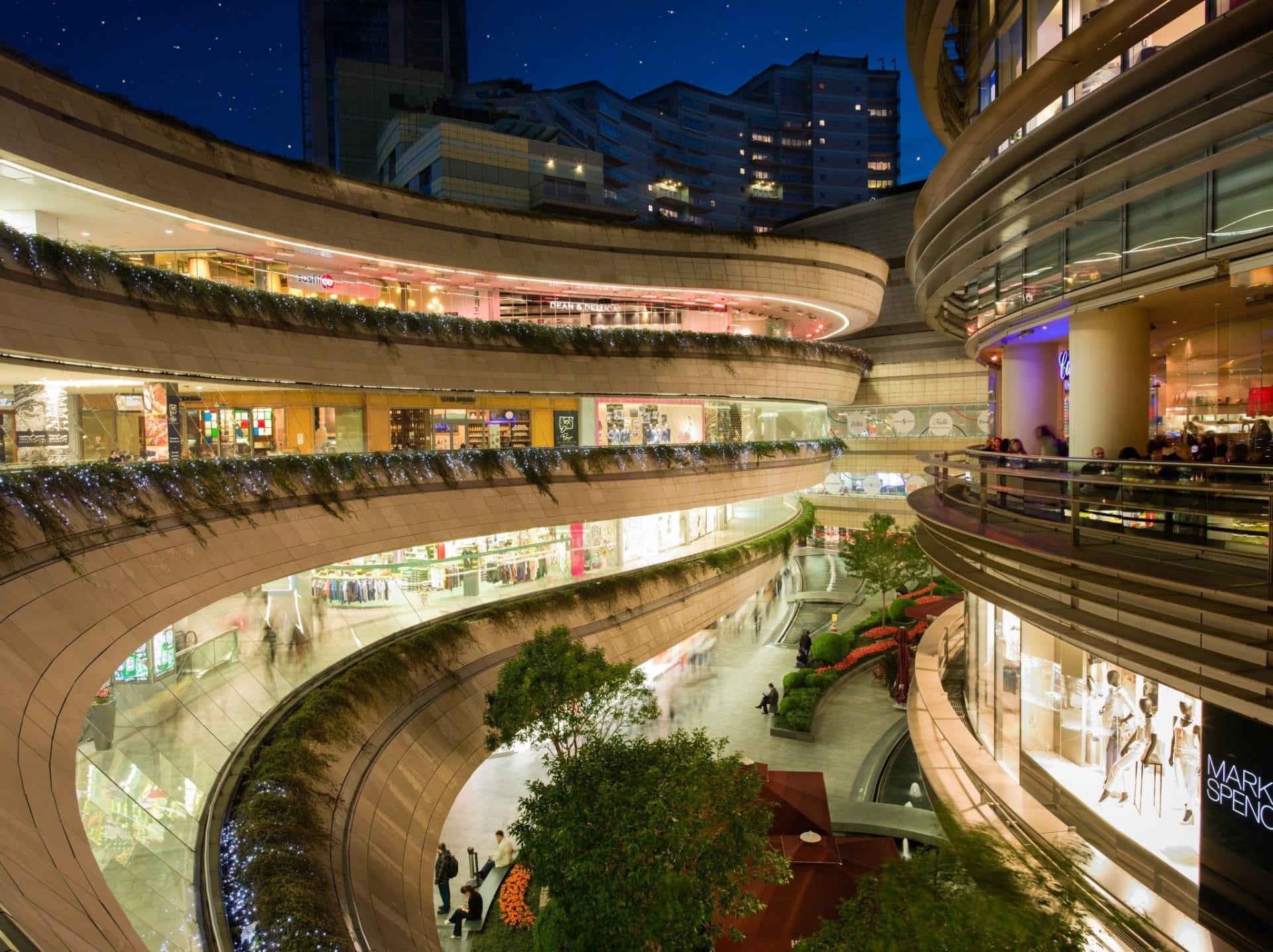 Kanyon is a unique open-air shopping mall with modern architecture, featuring high-end stores, fine dining, and a lively atmosphere.